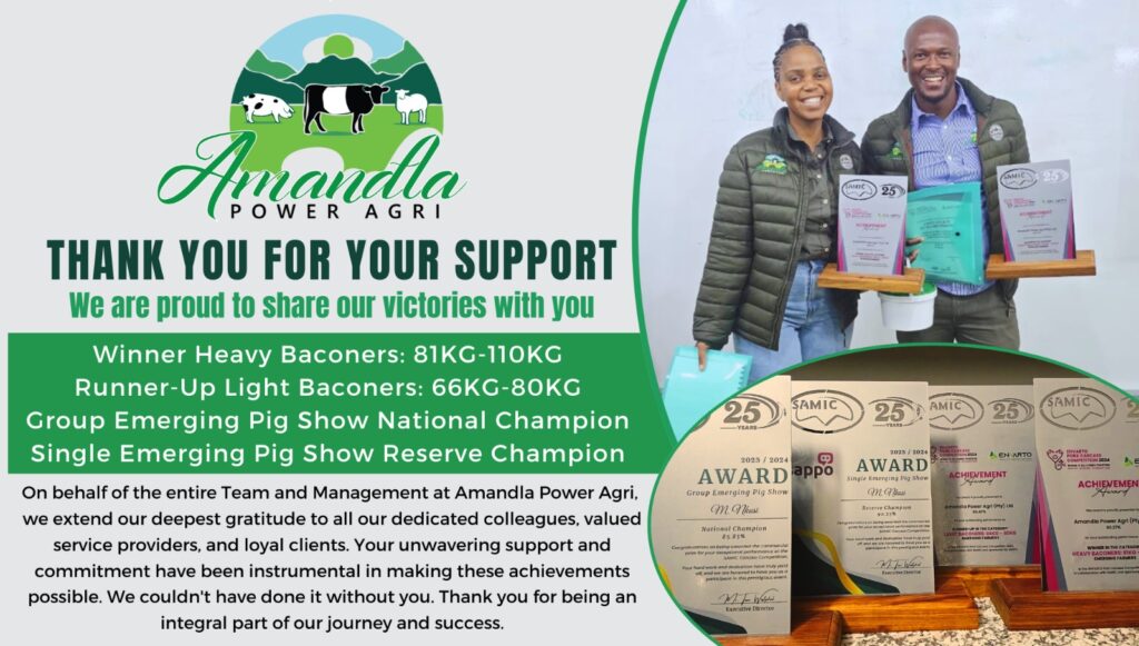 Our pig production enterprise stands out because we focus on quality. Moreover; Amandla Power Agri won SAMIC Annual National Carcass Competition for three consecutive years, for heavy baconer 81kg-110kg, light baconer 66kg-80kg, group emerging pig show national champion and single emerging pig show reserve champion.